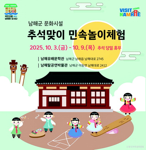 이번 추석 연휴(10.3.~10.9.)에는 추석 당일(10.6.)을 제외한 전 연휴 기간 동안 남해유배문학관, 남해탈공연박물관, 바래길작은미술관(남해군 남면 남면로1739번길 46), 뮤지엄남해(남해군 창선면 연곡로 13) 등 관내 문화시설들이 모두 정상운영된다. 보물섬시네마(남해군 남해읍 선소로 12)는 추석 당일에도 손님을 맞을 예정이다.