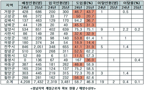 특히 어촌에 있어서 계절근로자는 조업성수기 동안 탄력적 인력공급을 통해 조업 효율성을 높이고 비수기에는 계약종료 및 귀국을 통해 인건비 지출을 줄임으로써 어가의 경영 안정성과 인력운영 효율성 확보에 기여하고 있다. 그런데 계절근로자의 배정 인원 및 도입율을 살펴보면 지자체별로 그 편차가 심한 것으로 나타난다.