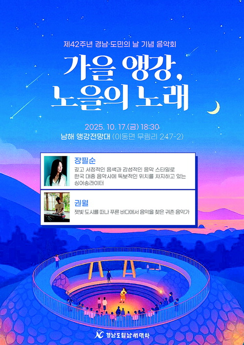 이번 공연은 제42회 경남 도민의 날을 기념하고 지역민에게 문화 향유의 기회를 제공하기 위해 마련됐다. 무대에는 싱어송라이터 장필순과 남해 귀촌음악가로 활발히 활동 중인 음악가 권월이 함께해 깊어가는 가을밤의 정취를 노래할 예정이다.