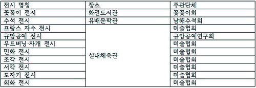 행사 기간 동안 화전도서관, 유배문학관, 실내체육관 등에서 예술작품 전시회가 상시 운영된다.