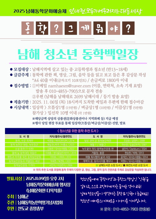 참가 대상은 남해지역에 살고 있는 중고등학생과 청소년(만13~18세)이며. 동학에 관한 책, 영상, 그림, 음악 등을 읽고 보고 들은 후 감상문 작성하면 된다.