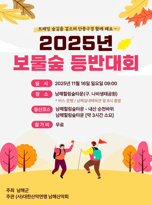 남해군은 오는 11월 16일 남해힐링숲타운(구 나비생태공원)에서 '2025년 보물숲 등반대회 행사'를 개최한다고 밝혔다.