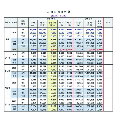 남해군농업기술센터에 따르면 이 기간(11.10~11.25) 동안 누적 출하량은 전년 동기(744톤) 대비 13% 감소한 647톤인 반면 전체 누적 출하금액은 전년 동기(20억 3000만원)보다 28%로 증가한 26억 600만원)인 것으로 나타났다.