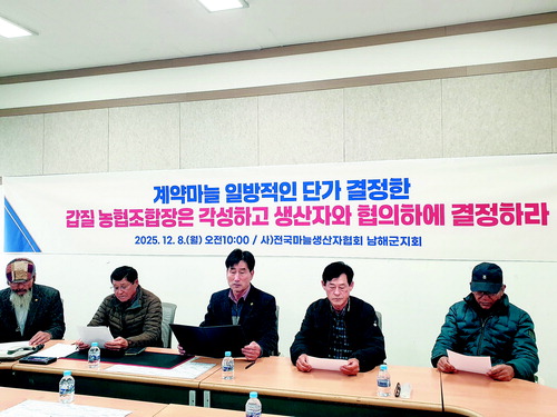 군내 농가들이 마늘계약재배 단가 결정과 관련 농협은 그동안 계약 당사자인 마늘생산자를 배제한 채 일방적으로 결정해 왔다며 앞으로는 반드시 생산자와의 합의 아래 단가를 결정하라고 촉구했다. (사)전국마늘생산자협회 남해군지회 임원 및 남해군마늘생산자 일동은 지난 8일 군청브리핑룸에서 (사)전국마늘생산자협회 권혁정 사무총장을 비롯 인근 지자체 생산자 대표들이 함께 참석한 가운데 기자회견을 열었다. 이 자리에서 이들은 남해마늘재배 면적은 갈수록 감소하고 있어 또다시 주산단지의 지위를 잃게 될 위기에 처해 있다고 진단하고 그 원인 중 하나로 갈수록 낮게 결정되는 계약재배 단가를 지적하며 요구사항을 담은 성명서를 발표했다. 이들은 우선 그간 지속 되어온 계약재배 마늘단가 결정은 생산농가를 배제한 농협의 일방적인 결정이었다며 농협은 마늘 생산농가들이 참여하는 계약마늘 단가협의회를 구성해 결정할 것을 주장했다.