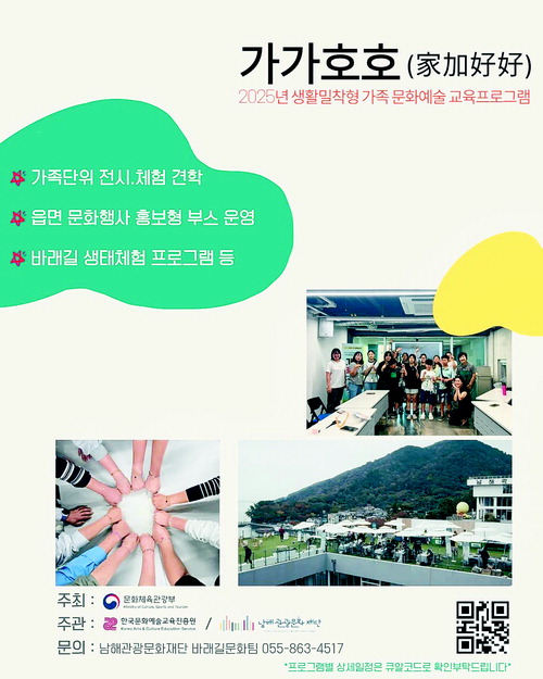 남해관광문화재단(대표이사 김용태)은 문화체육관광부가 주최하고, 한국문화예술교육진흥원이 주관하는 2025년 생활밀착형 가족 문화예술프로그램 '가가호호(家加好好)'사업에 대한 추가 교부금 2천만원을 확보했다고 밝혔다. 이로써 재단은 기존 6천만원 사업비에 추가 지원금 2천만원이 더해져 총 8천만원의 국비로 206년 2월까지 가족대상 홍보형 기획사업을 운영하게 되었다.