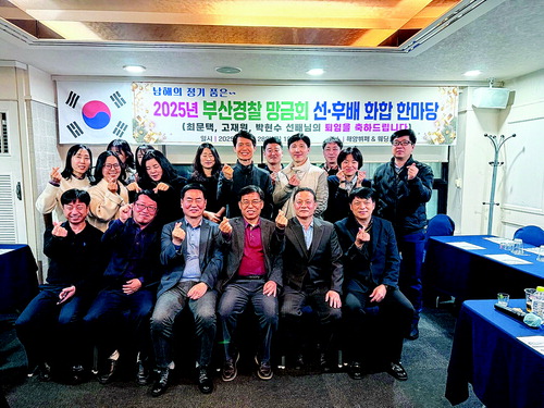 부산지방경찰청 산하 남해 출신 경찰들의 친목 단체인 망금회(회장 한석봉)는 지난달 28일 연산동 해암뷔페에서 송년회를 열고 한 해를 마무리했다. 이날 행사에는 40여 명의 회원이 참석했으며 김진표 총무의 사회로 진행 되었다.