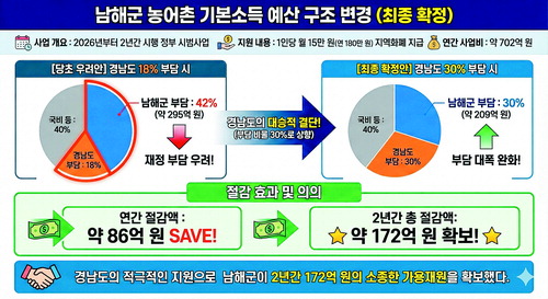 당초 경상남도는 세수 부족 등 악화된 재정 여건으로 인해 도비 분담률에 대해 신중한 입장을 보였으나, 시범사업의 성공적 안착과 남해군의 재정 부담 완화를 위해 정부 가이드라인인 '도비 30%'를 전격 수용하는 용단을 내렸다. 이로써 남해군은 안정적인 사업 추진 동력을 확보함과 동시에, 시범사업 기간인 2년 동안 총 172억 원에 달하는 군비를 절감, 지역 현안 해결에 투자할 수 있는 막대한 재정적 여유를 갖게 됐다.
