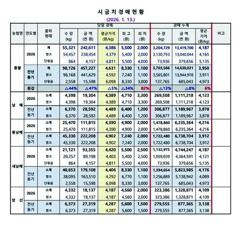 13일 현재 누적 평균가격 전년대비 6% 증가 4,187원(kg)