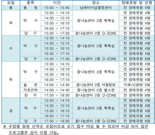 참가 대상은 남해군 관내 복지카드 소지 장애인(성인·청소년) 및 특수교육대상자로, 장애 유형과 연령 특성을 고려한 맞춤형 생활체육 프로그램으로 구성된다.