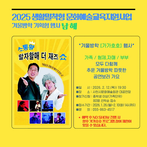 남해군관광문화재단은 '2025 생활밀착형 문화예술교육 지원사업 가가호호(家加好好)' 겨울방학 기획행사의 일환으로, 오는 2월 12일 사천시문화예술회관 대공연장에서 열리는 <(소통왕) 말자할매 더 재즈 쇼> 관람객을 모집한다고 밝혔다.