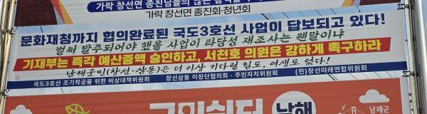 이에 국도3호선 조기착공을 위한 비상대책위원회를 비롯 창선·삼동 이장단협의회, 주민자치위원회, (전)창선미래연합위원회를 주축으로 한 지역민들은 '국가유산청까지 협의 완료된 국도3호선 사업이 답보되고 있다'는 프랭카드를 게첨하는 등 강하게 반발하고 있다."응급차도 갇히는 도로,