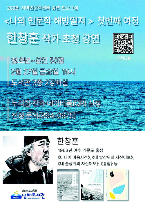 경상남도교육청 남해도서관(관장 윤순점)은 오는 2월 27일(금) 저녁 7시, 소설가 한창훈 작가를 초청하여 <바다에서 만난 인문학>을 주제로 2026년 인문학 강연의 첫 문을 연다.