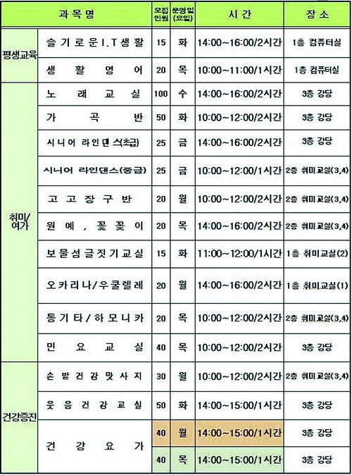 평생교육, 취미여가, 건강증진 프로그램 등 15개 강좌 운영