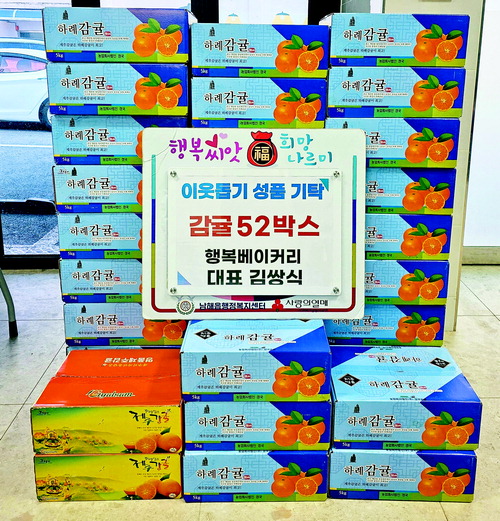 남해읍소재 행복베이커리 김쌍식 대표가 지난 2일, 지역 내 어려운 이웃을 돕기 위해 감귤 52박스를 남해읍행정복지센터에 기탁했다.