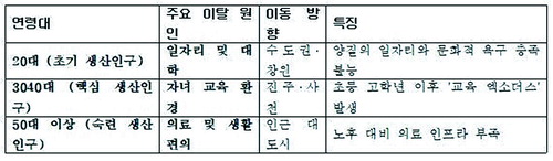 그렇다면 연령대별 전출 이유는 무엇일까. 학계의 인구 이동 이론과 남해군이 전출입 데이터, 전출지 등을 종합분석해 보면 남해군의 생산인구 감소의 주된 원인을 연령대에 따라 다르게 나타난다.