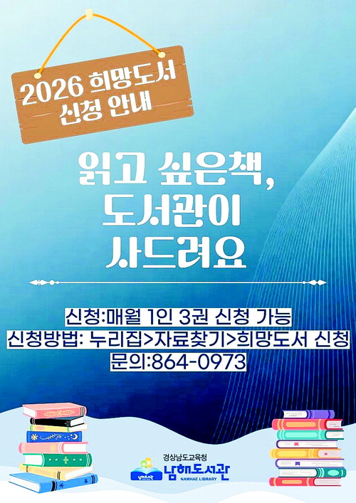 경상남도교육청 남해도서관(관장 윤순점)은 지역민들이 직접 만드는 서가, 지역 독서 문화 활성화를 위해 연중 희망도서 신청을 받아서 운영한다.