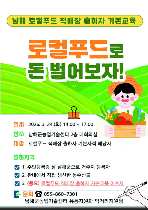 남해군은 오는 3월 24일 오후 2시 남해군 농업기술센터 2층 대회의실에서 '2026년 상반기 로컬푸드 직매장 출하자 기본교육'을 실시한다고 밝혔다.