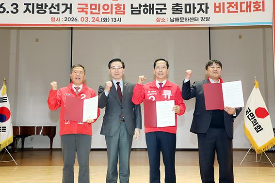 국민의 힘 사천·남해·하동 당원협의회는 지난 24일 '6·3 지방선거 압승을 위한 남해군 출마자 비전대회'를 개최했다. 이번 행사는 출마 예정자들이 당원들 앞에서 정책과 비전을 직접 발표함으로써 결속을 다지고 공정한 경쟁을 약속하기 위해 마련되었다.