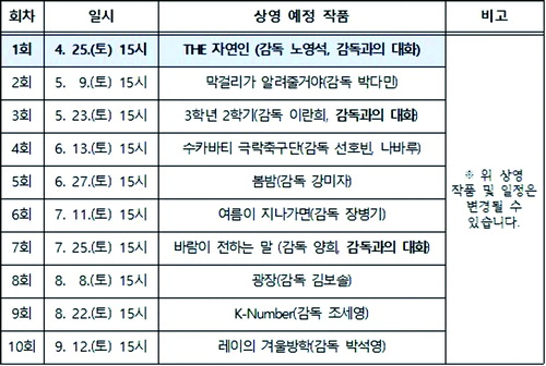 상영은 2026년 4월부터 9월까지 총 10회에 걸쳐 진행되며, 매회 토요일 오후 3시에 운영된다. 주요 상영작과 상영일정은 △4월 25일 'THE 자연인(감독 노영석)' △5월 9일 '막걸리가 알려줄거야(감독 박단비)' △5월 23일 '3학년 2학기(감독 이란희)' △6월 13일 '수카바티: 극락축구단(감독 선호빈, 나바루)' △6월 27일 '봄밤(감독 강미자)' 등이다.