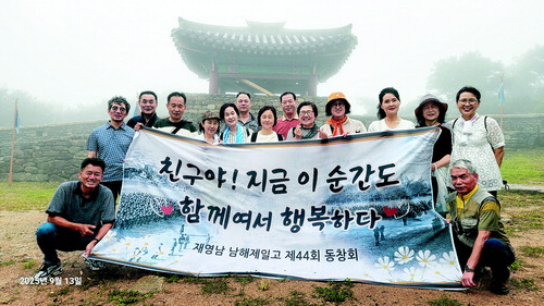 재영남남해제일고 44회 동창회(회장 허 민)는 지난 13일 금정산 일원에서 정기 모임을 개최했다. 이날 회원들은 비가 내리는 날씨에도 불구하고 안개 낀 숲속의 운치를 느끼며 산행을 가진 뒤 금성동 솔밭공원식당에서 기념식을 열고 화합의 시간을 가졌다.