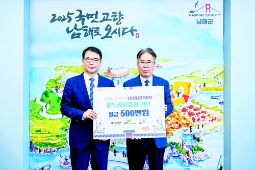 남해군은 지난 26일 LH경남지역본부(본부장 임도식)로부터 온누리상품권 500만원을 기탁받았다고 밝혔다.
