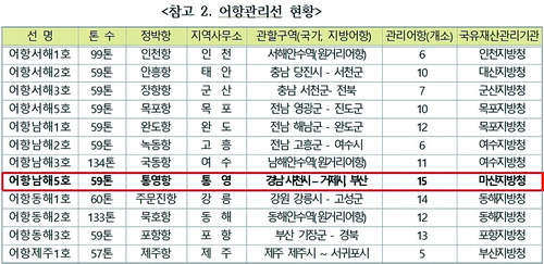 한편, 서천호 의원은 국가어항이 전남은 34개, 경남은 20개임에도 어항관리선은 전남이 4대, 경남은 1대밖에 운영(참고 2)하지 않고 있는 상황에 대해서도 문제를 제기하며, 관리수요가 높은 경남권에 추가 배치를 촉구했다.