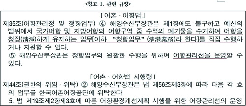서천호 의원은 "「어촌·어항법」제35조제4항 및 제5항(참고 1)에 따라 국가어항 및 지방어항의 폐기물을 수거하여 어항을 청정하게 유지하는 업무(이하 '청항업무')를 위해 어항관리선을 운영하도록 규정하고 있고, 이 업무를 해양수산부는 한국어촌어항공단에 위탁하고 있다"면서 "그러나 공단은 이번 7월 집중호우 시 남강댐 방류로 인해 해양쓰레기 피해를 입은 사천·남해·하동의 국가어항(신수항, 미조항, 노량항) 및 지방어항(대포항, 늑도항, 중항항, 낙지포항, 구노량항, 중평항, 술상항)에 대해서는 전혀 어항관리선을 운영하지 않았다"고 지적했다.