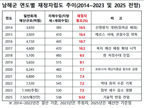 남해군의 '2025년도 예산안'을 분석한 결과, 재정자립도는 약 9.52%를 기록할 것으로 전망된다. 수치상으로는 2018년 수준을 회복하며 뚜렷한 반등세를 보이고 있다.