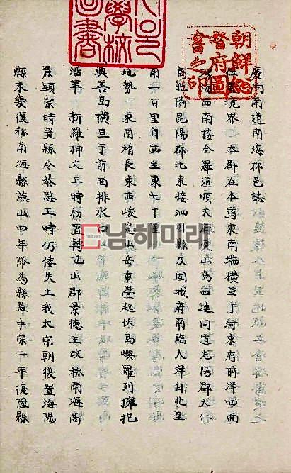 남해군은 경남도 동남단, 하동부(河東府) 앞바다에 있는 섬으로, 사면이 바다로 둘러싸여 있다.