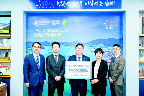 한화생명금융서비스(주)(대표이사 최승영)가 연말을 맞아 사회공헌활동의 일환으로 남해군인재육성재단에 인재육성기금 500만원을 기탁했다.