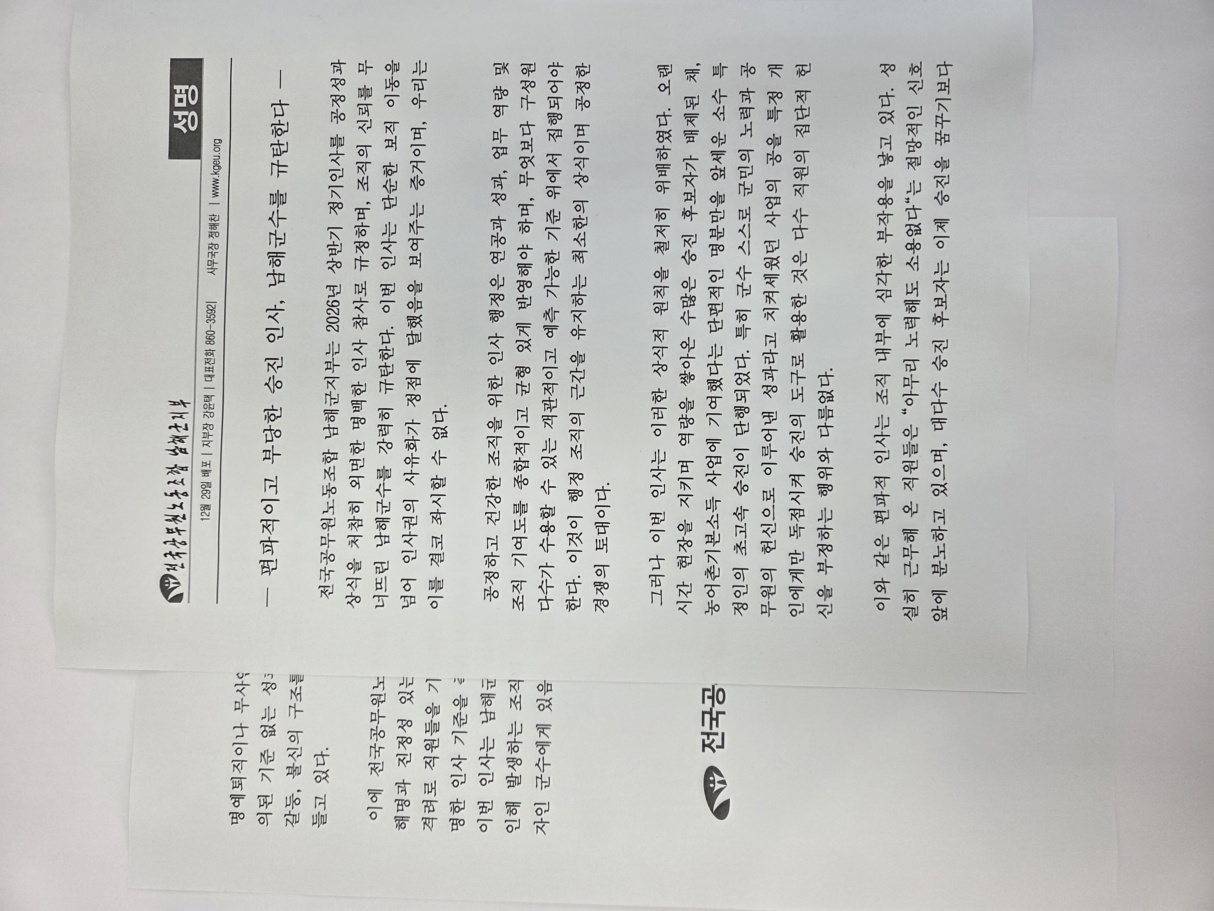 노조는 성명서에서 "오랜 기간 현장을 지키며 역량을 쌓아온 수많은 승진 후보자가 배제된 채, 특정 사업에 기여했다는 단편적인 명분만으로 소수 특정인의 초고속 승진이 이뤄졌다"고 주장했다.