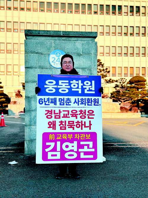 경남교육감 출마 예정자인 김영곤 전 교육부 차관보는 2026년 1월2일 오전, 경남교육청 앞에서 웅동학원의 사회환원 이행을 촉구하는 1인 시위를 진행하고, 경남교육청의 장기적인 방관 행정을 강하게 비판했다.
