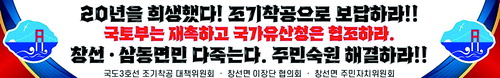 이에 국도3호선 조기착공을 위한 비상대책위원회를 비롯 창선·삼동 이장단협의회, 주민자치위원회, (전)창선미래연합위원회를 주축으로 한 지역민들은 '국가유산청까지 협의 완료된 국도3호선 사업이 답보되고 있다'는 프랭카드를 게첨하는 등 강하게 반발하고 있다."응급차도 갇히는 도로,