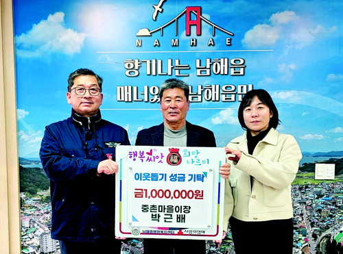 남해읍행정복지센터는 지난 1월 29일 지역 내 어려운 이웃을 돕기 위해 박근배 중촌마을이장이 이웃돕기 성금 100만 원을 기탁했다고 밝혔다.
