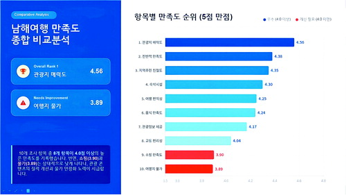 만족도 조사에서도 이러한 경향은 뚜렷했다. '관광지 매력도'(4.56점)와 '지역 주민 친절도'(4.35점)는 매우 높은 점수를 받아 남해의 핵심 경쟁력이 '자연'과 '사람'임을 입증했다.