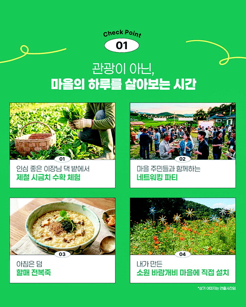 '바람개비 팜캉스'는 '바람개비 마을'로 불리는 삼동면 내동천마을에서 펼쳐진다. 바람개비 학교에서 경험할 수 있는 나만의 바람개비 만들기 체험부터 인심 좋고 입담 좋은 내동천마을 이장과 함께하는 시금치 캐기 체험까지, 남해가 아니면 느낄 수 없는 '찐 로컬 감성'으로 채운 여행프로그램이다.