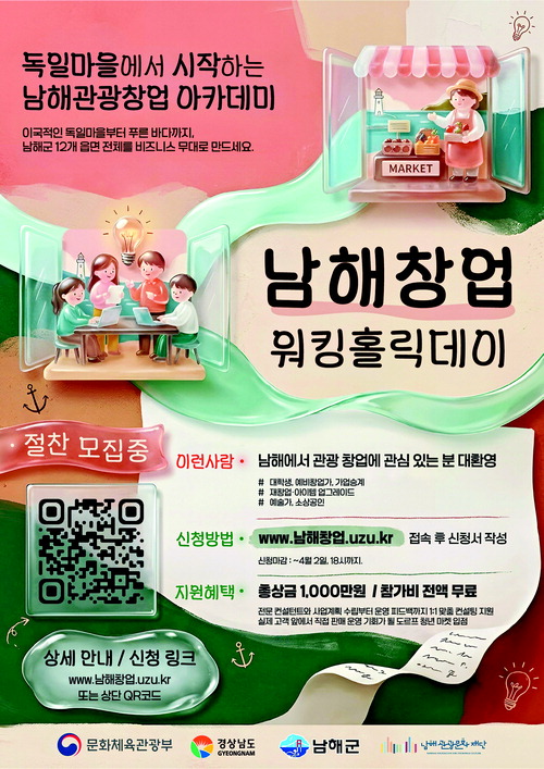 남해관광문화재단(대표이사 김용태)은 관광 기반 창업 몰입 프로그램 '남해 창업 워킹홀릭데이'에 함께할 참가자를 오는 4월 2일까지 모집한다고 밝혔다.