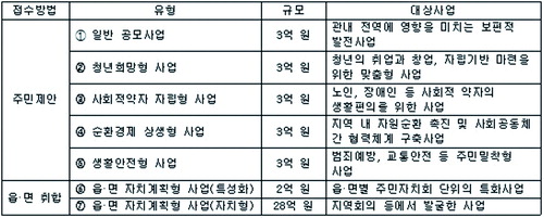 주요 내용은 보편적 군정 발전을 위한 '일반 공모', 청년 맞춤형 지원인 '청년희망형', 취약계층 생활 밀착형인 '사회적 약자 자립형' 등이다.