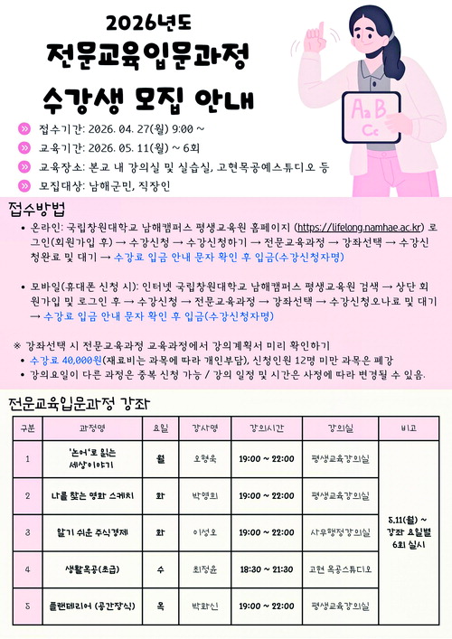 국립창원대학교 남해캠퍼스(부총장 박경훈) 평생교육원에서 2026년도 전문교육과정 시범운영 군민 맞춤형 프로그램 입문과정 수강생을 모집한다.